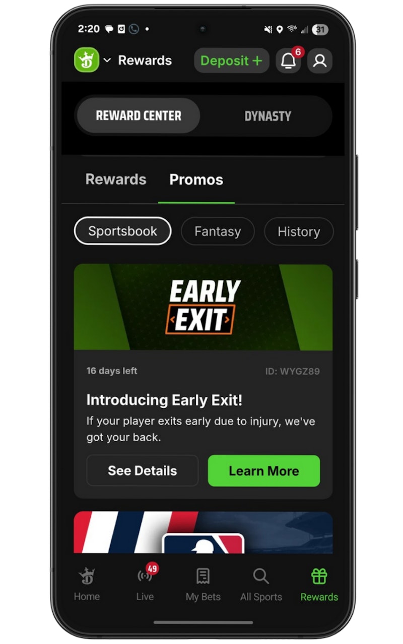 One notable detail from DraftKings’ Early Exit program is that it only applies when a player leaves the game due to injury in certain sports, such as the NFL, MLB, and NHL. This means that if a player is removed for performance reasons, ejected, or benched, the bet will not qualify for Early Exit.