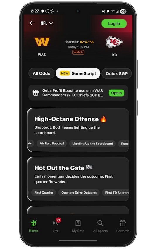 To use GameScript, select an NFL game in the DraftKings Sportsbook app and choose the GameScript tab next to the SGP Builder. From there, pick one of five themes that best match how you expect the game to play out. DraftKings will then show relevant props that fit that narrative. You can combine eligible picks into a Same Game Parlay or add others as straight bets, streamlining the process of building a bet that matches your predicted “game script.”