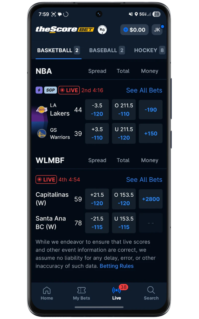 What Stood Out: theScore Bet performs best when it comes to odds update speed. During live action, odds move quickly enough to keep pace with the game, which is one of the biggest things bettors want from a live betting app. It also does a solid job with market availability, giving users enough live options to stay engaged without feeling too bare bones. Where it falls a bit short is in the overall feel of the experience, as the bet slip, navigation, and market stability are all good rather than great. Even so, the fast-moving odds help theScore Bet stand out more than some of the apps around it.