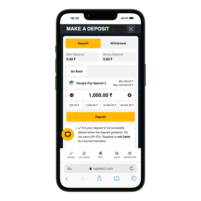 Rajabets provides you with a wide range of UPI options, including Google Pay. The one demerit is that the minimum deposit with Google Pay is quite high at ₹500. Also, you cannot withdraw with Google Pay on Rajabets.