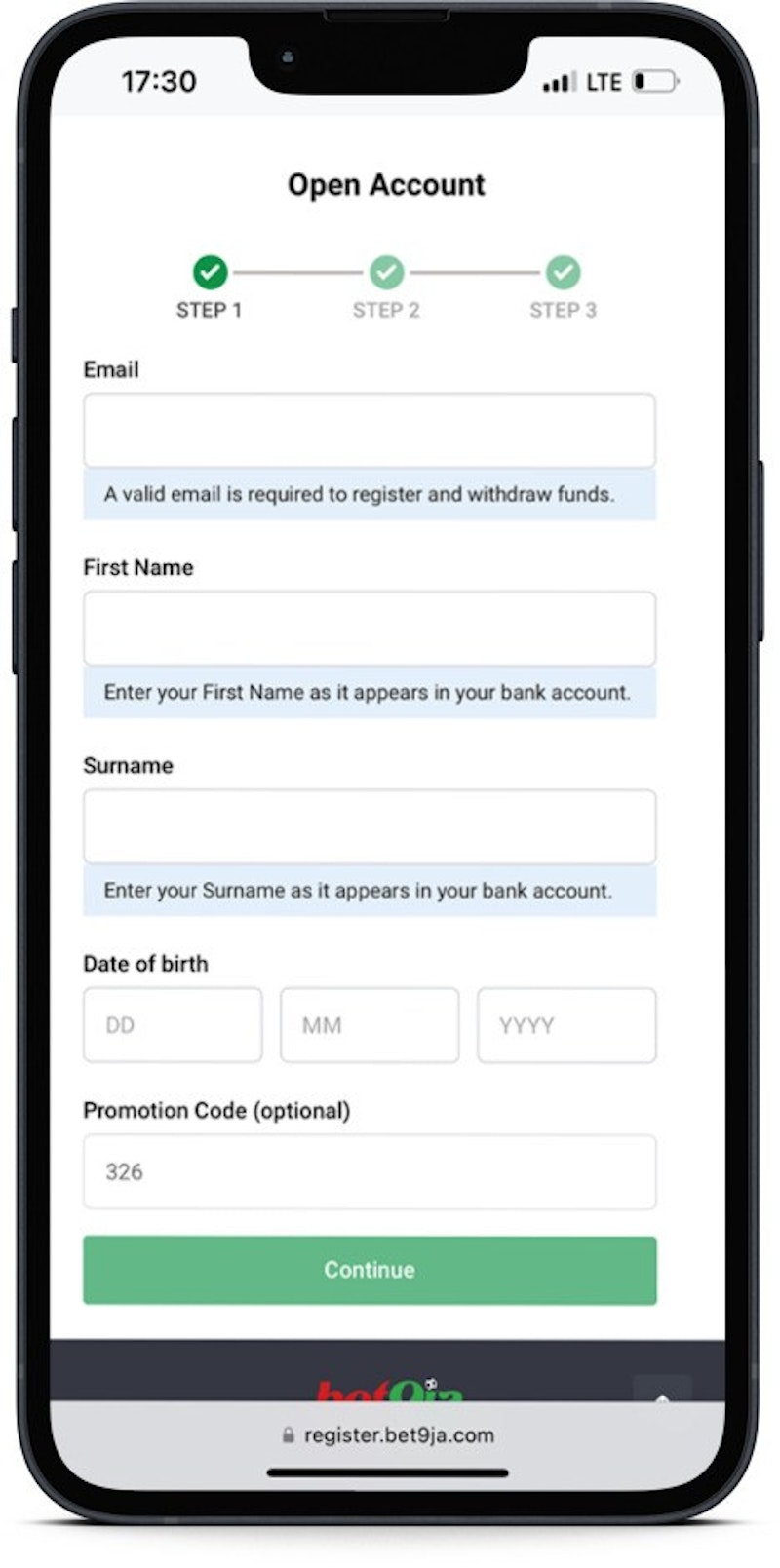 Certain personal information is usually required during the Bet9ja registration process.