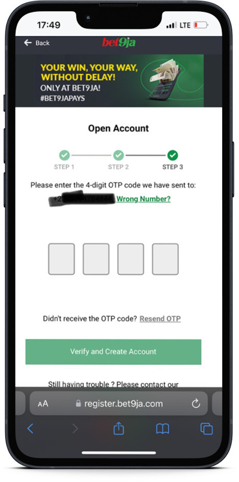 Another issue that may arise when signing up with Bet9ja is when you enter the wrong phone number. It could be a simple error of missing one number or mixing up the numbers, but whatever it is, your registration will not be processed.