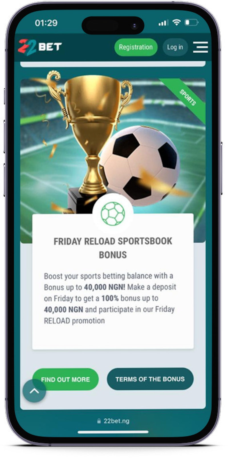 One of the more impressive free bet offers on the 22bet app is the Friday Reload which offers you 100% bonus up to 40,000 NGN every weekend.
