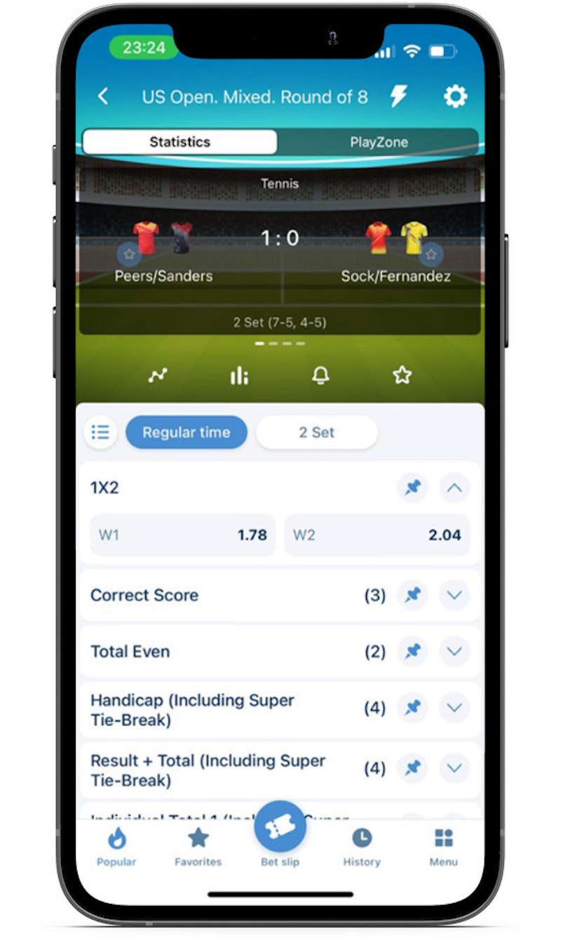 The tennis section of the 1xbet app also has vast live betting markets that go beyond the win/lose options.