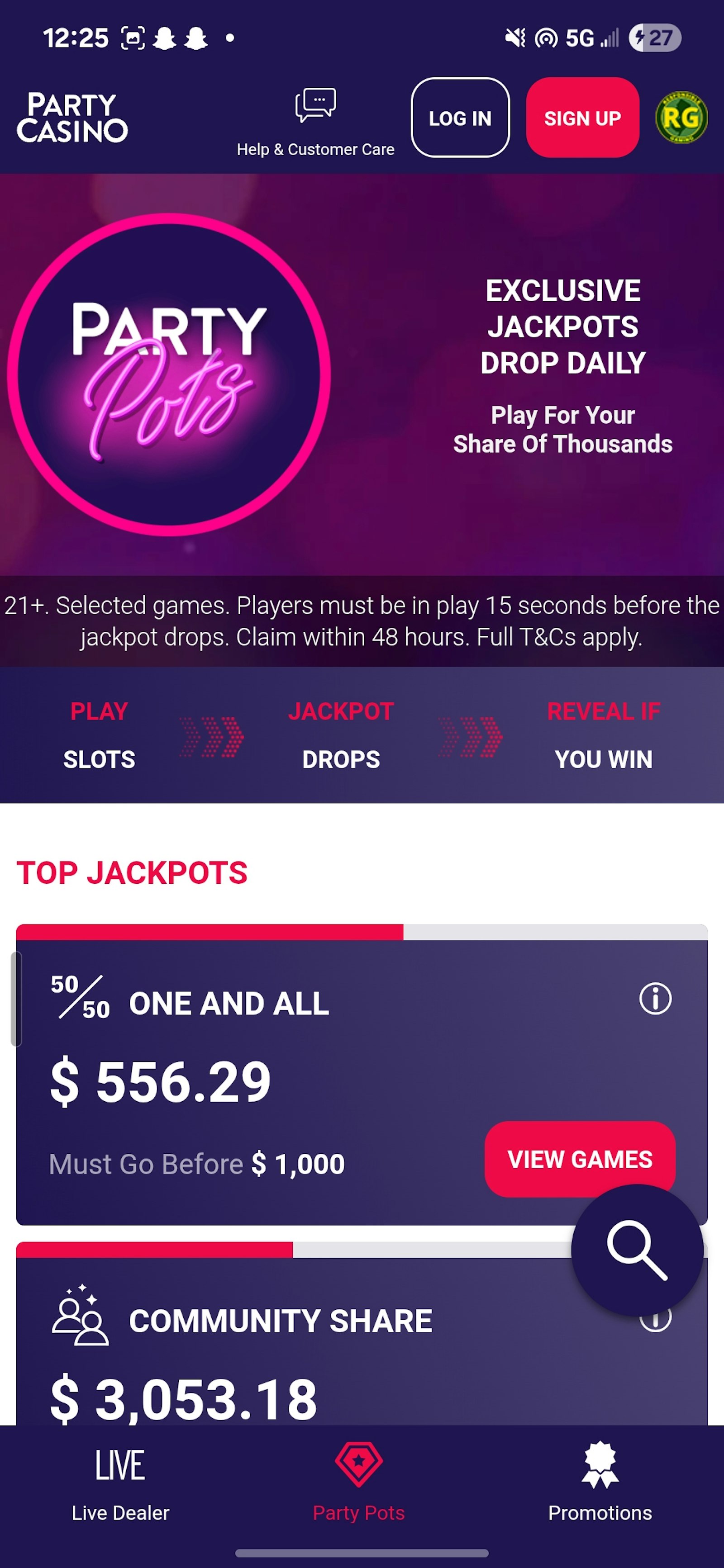 The most unique aspect of PartyCasino is the 'Party Pots' jackpots. These are daily jackpots that must be hit by a certain time. They vary in size from hundreds to thousands of dollars. It's easy to find the games that award them, as there is a separate tab for Party Pot games in the app.