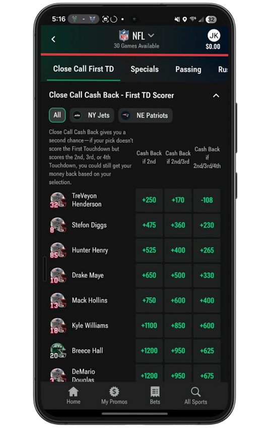 Close Call First TD is one of the better touchdown props/promos we’ve seen this season. It takes some volatility out of first TD betting by giving you a safety net if your player scores early but not first.