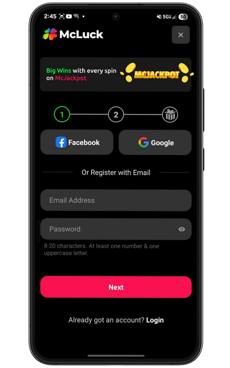To sign up for McLuck, you’ll usually need to provide an email address and create a password. Some users may have the option to register using a phone number instead.