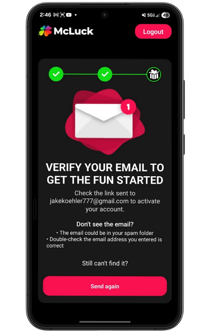Verification timing can vary depending on the app. Some platforms require it before your first play, while others ask for it when you try to redeem a prize. Here, McLuck first requires players to verify their email address.