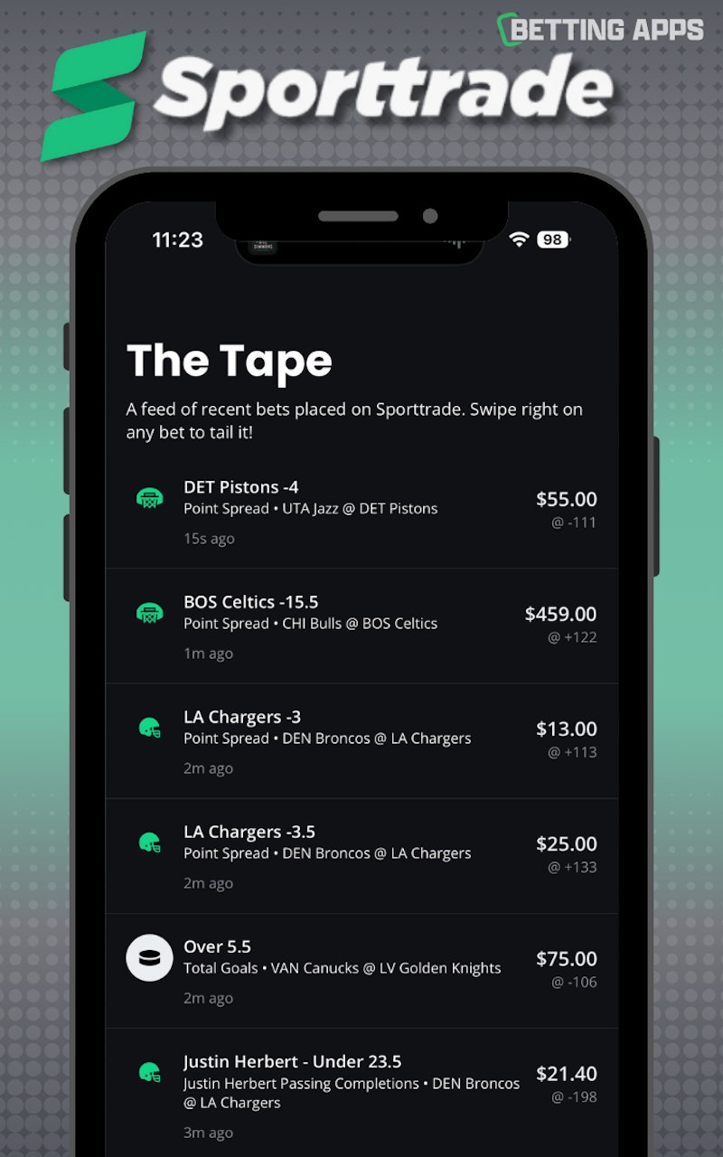 The Tape is a cool feature on Sporttrade that allows you to see all of the most recent bets placed on the app. While there are social betting groups on other apps like DraftKings Sportsbook, those are only for those who join a group, not the community as a whole.