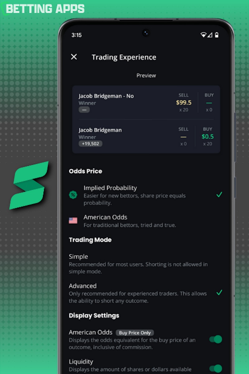 The best part about the in-app user experience on Sporttrade is the customizability. Some of it is functional, while other settings are purely for visual preference. You can change from American odds to implied probability, choose simple or advanced mode, and turn on/off the liquidity display. Being able to customize your settings greatly adds to the overall user experience