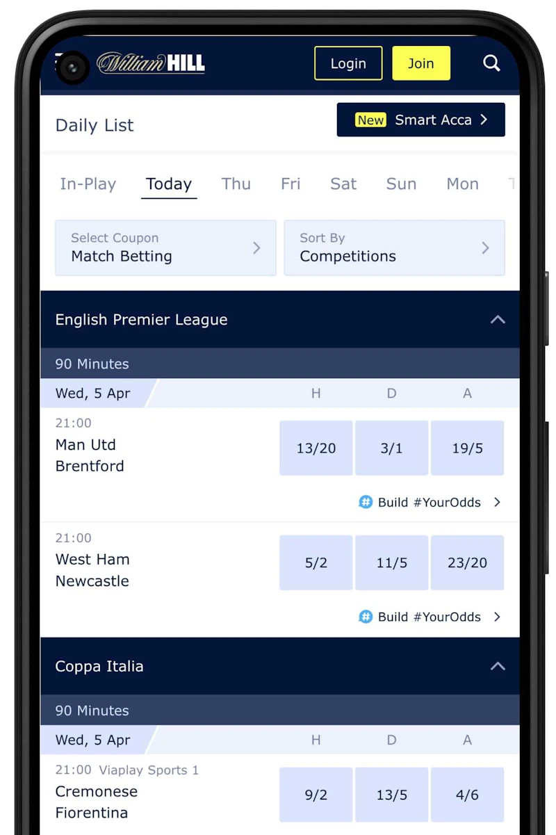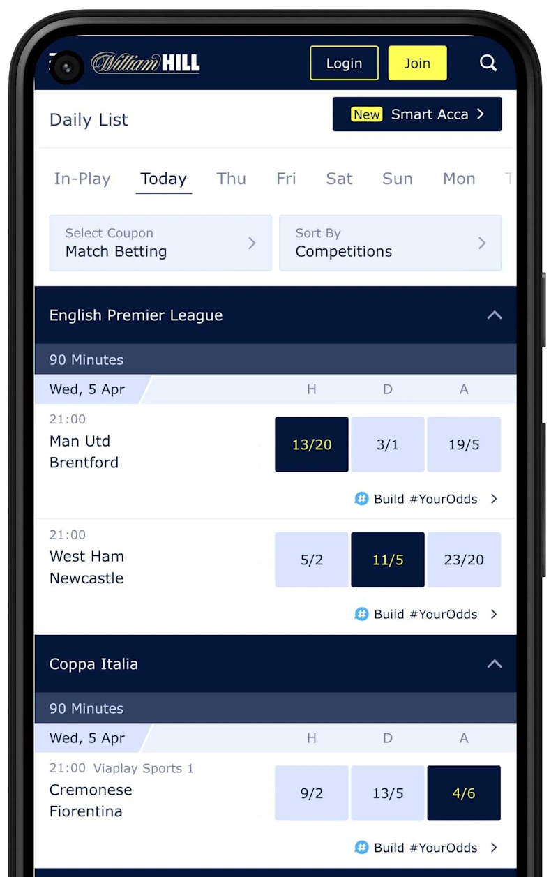 The daily matches/races are displayed after selecting your sport of choice. Now, tap the odds you see for your selection. Your accumulator selections will be added to your bet slip at the bottom of your screen.