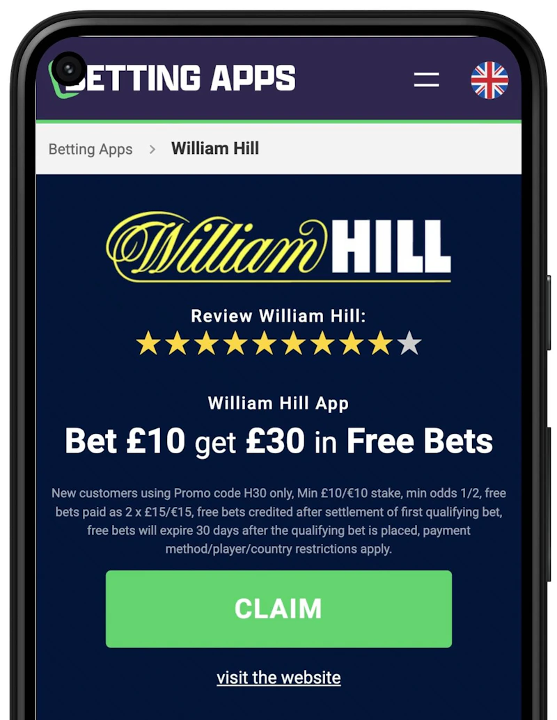 Firstly, 'Claim' the William Hill ‘Bet £10 get £30’ signup offer via Bettingapps.com.