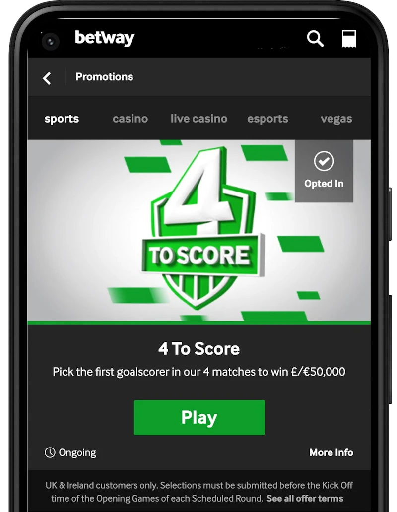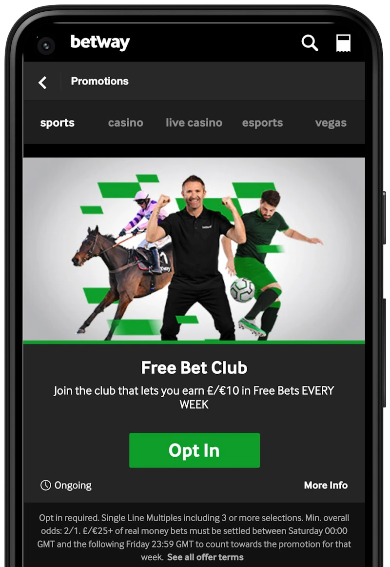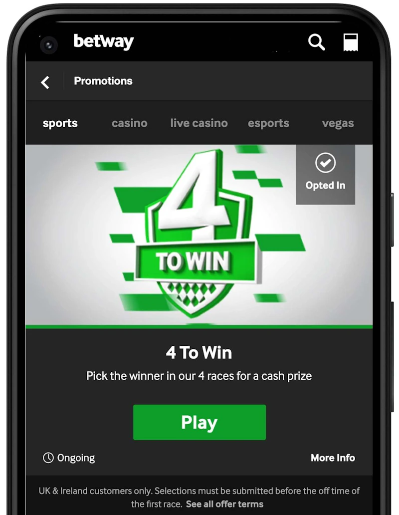 However, Betway have lots of promotions for existing customers, including the Betway Free Club (where you can earn up to £10 in free bets every week), free-to-play prediction games like 4 to Win and 4 to Score to win large cash prizes and access to specials through Betway Boosts.