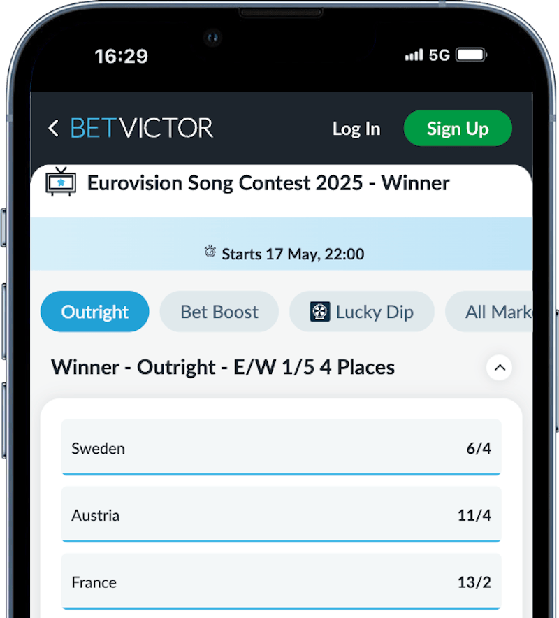 The BetVictor app is a decent option for Eurovision betting. You can access the event through the Entertainment section. On BetVictor, you can bet on the outright winner of Eurovision and the platform also offers bet boosts for select picks. Another fun feature on BetVictor is Lucky Dip, where you enter your stake and get a random selection. You don’t choose the outcome yourself, but you might land better odds than usual.
